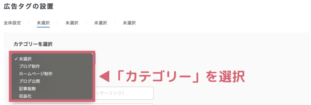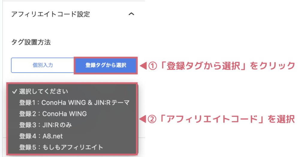 登録タグから使いたい「アフィリエイトタグ」を選択する。