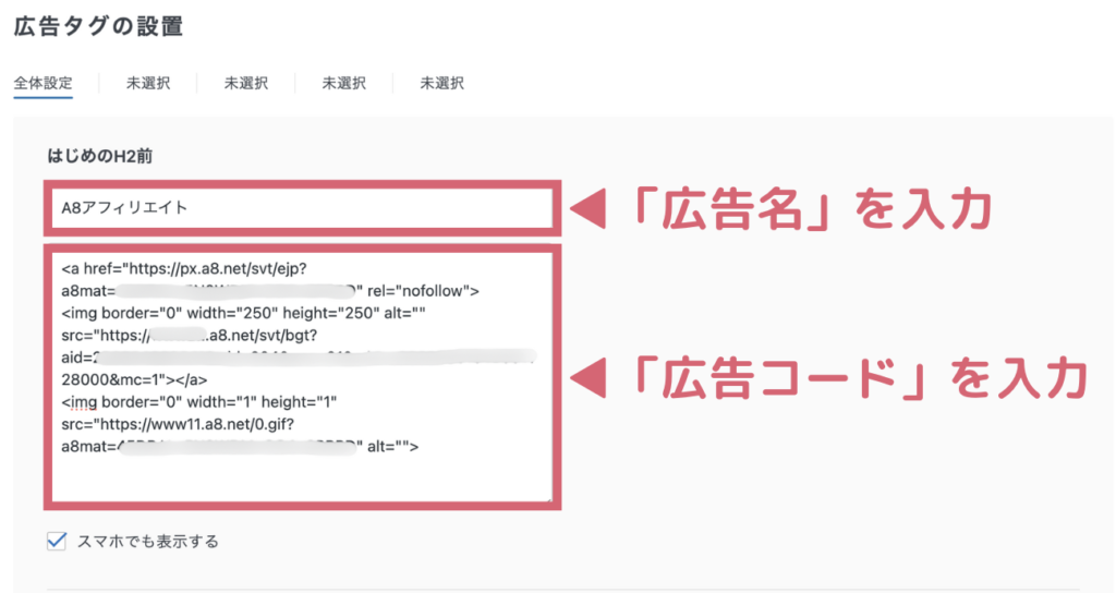 - アフィリエイトタグ管理でコードを登録し、記事で即呼び出せるようにする