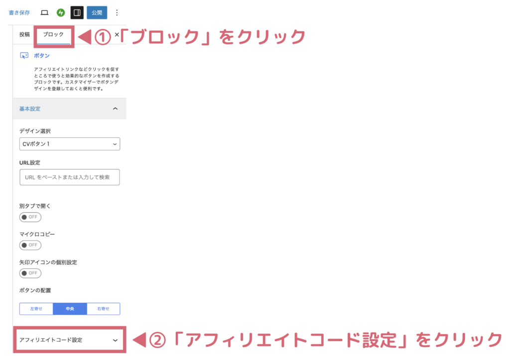 - 「アフィリエイトタグ管理」にコードを登録して、記事内のボタンから呼び出せるようになった