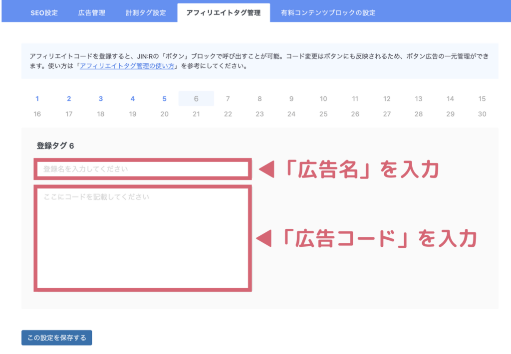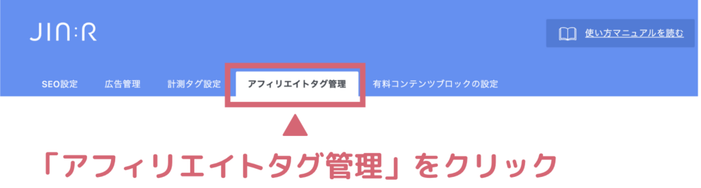 JINR設定内の「アフィリエイトタグ管理」をクリックする。