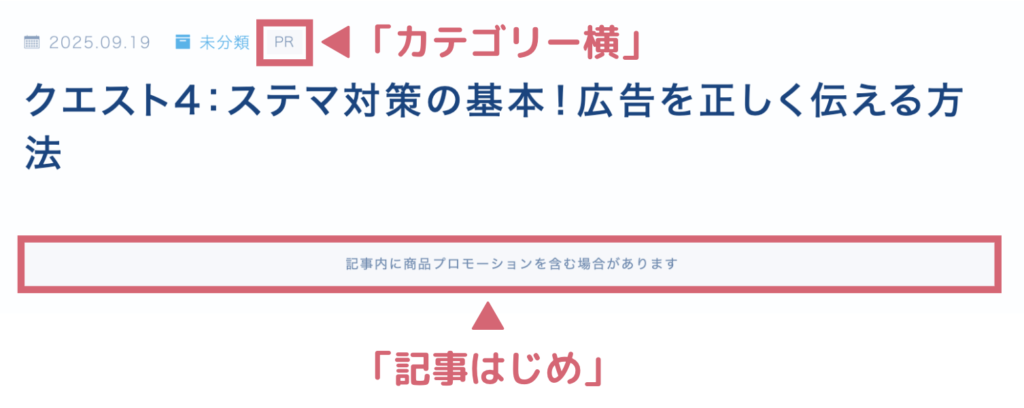 読者が一目で「これは広告なんだな」とわかるように、PR表記を見やすい位置に表示することが求められています。
