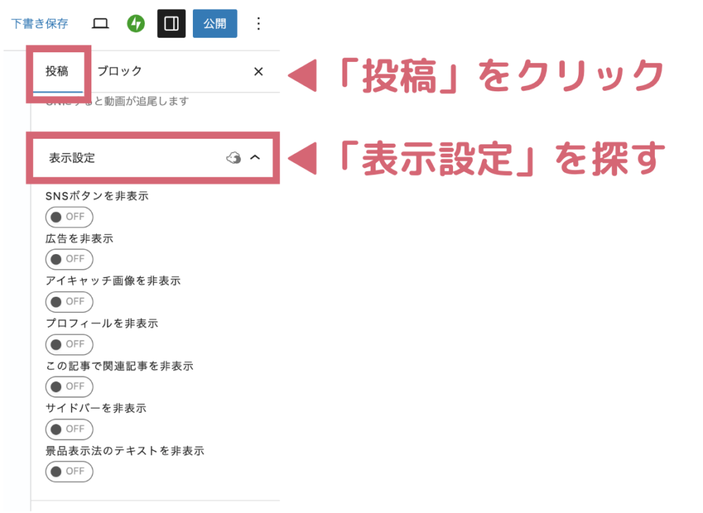 右サイドバーの記事下部にある「表示設定」を確認します。