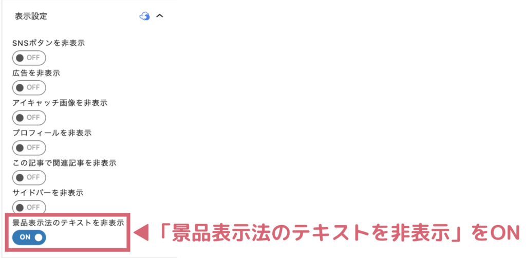 JIN:Rの投稿設定内にある「景品表示法のテキストを非表示」をONにします。